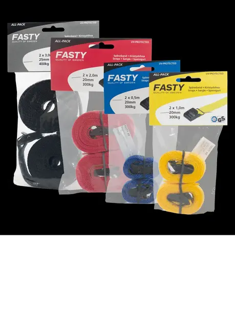 Fasty pakkremmer er laget av solid nylon og finnes i lengder fra 0,5 meter til 3 meter. Fasty er meget solide og har overlegne bruddstyrker. En praktisk ting man ikke kan være foruten i et bagasjerom.