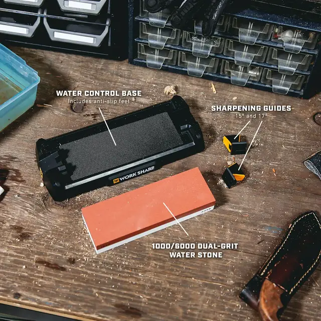 Work Sharp WHT våtslipestein er et slipesteinsystem med to korninger vannslipestein, og vinkeljigger for sliping av kniver og annet «eggverktøy» Slipesteinen har korning 1000 og korning 6000 laget av aluminiumoksyd i høyeste kvalitet. Steinen ligger i en base som gir god stabilitet som også samler opp vannsøl. Dette gir mindre rot, og raskere opprydding. Vinkeljiggene som følger med gjør det enklere å få en stabil vinkel og gjør slipingen raskere og enklere. Det følger med 2 utskiftbare vinkler på 15 ° og 17 °.
